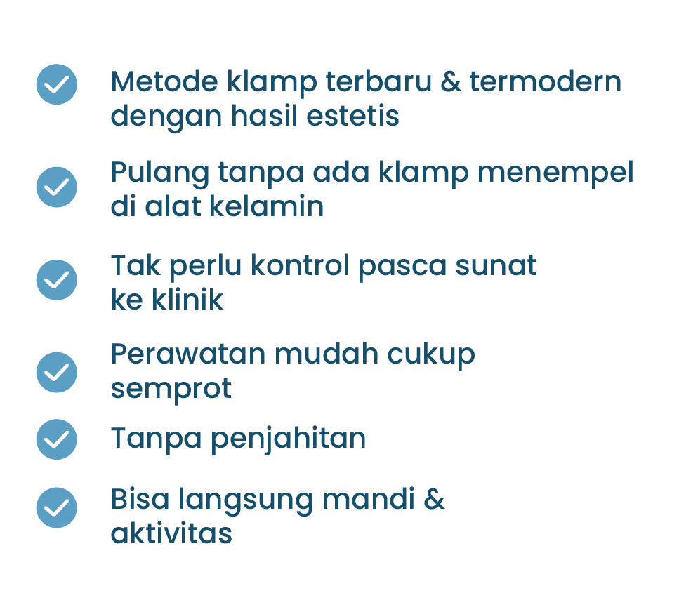 Metode Klamp Sealer (Lem) merupakan metode sunat terbaru dengan menggunakan alat klamp disposable sebagai media persisi dan alat persisi Elektro Surgical Unit (ESU) untuk memotong kulit preputium sehingga tidak terjadi pendarahan.
